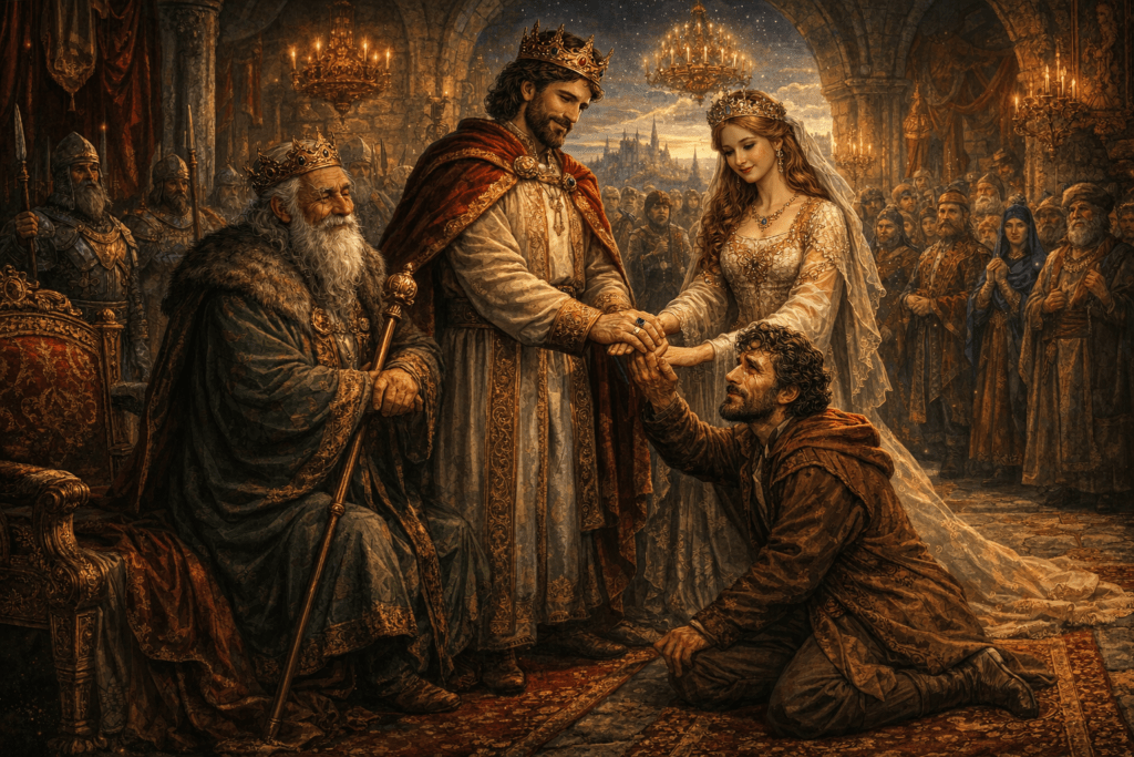 — Наистина, чуден пръстен ти е дала хубавицата. Дай да го премеря на моята ръка — да видим дали ще се изпълни каквото аз поискам.